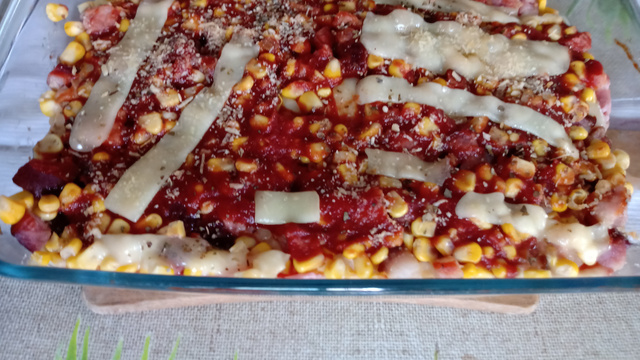 Espalhe os cubos de bacon e o milho verde por cima do arroz.