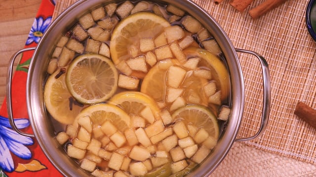 Acrescente o cravo-da-índia, a canela em pau, o gengibre, a laranja e os limões à mistura.