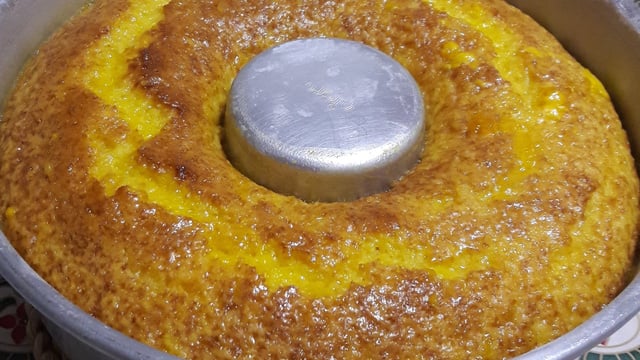 Quando o bolo estiver pronto, jogue a calda por cima com o bolo ainda quente.