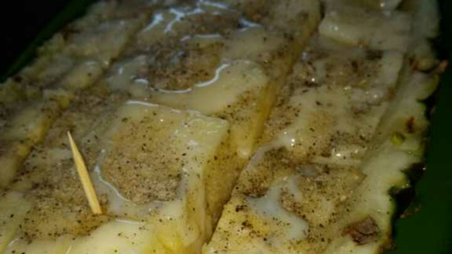 Em um vasilha, coloque o abacaxi, mel, sal e pimenta-do-reino.