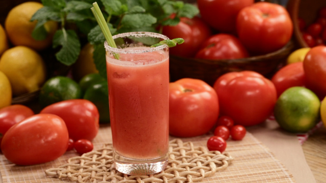 Coe o tomate batido no liquidificador e adicione uma dose de vodka, pimenta-do-reino, suco de limão, água com gás e gelo.