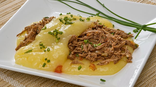 Escorra a mandioca e amasse com o garfo ou espremedor.