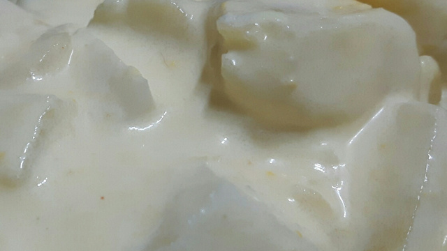 Minha maionese: batatas cozidas e picadas, azeitonas picadas, ovos cozidos e picados.