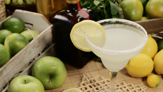Passe o limão na borda de uma taça e emborque-a sobre o sal com as raspas de limão no prato, para aderir bem.