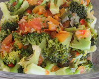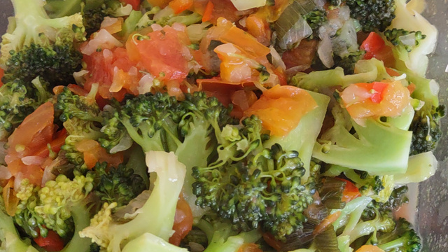 Depois coloque o brócolis, o tomate, o cheiro-verde, a cebola e sal a gosto.