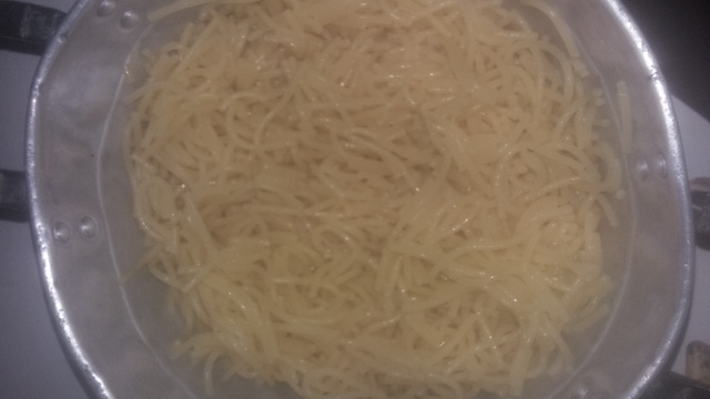 Agora pode desligar o fogo e escorrer o macarrão.