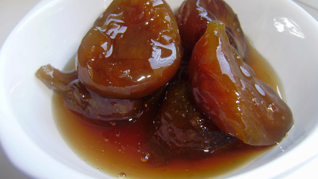 Acrescente meio copo de água, conforme a calda vá secando, até os figos tomarem uma coloração marrom dourada.