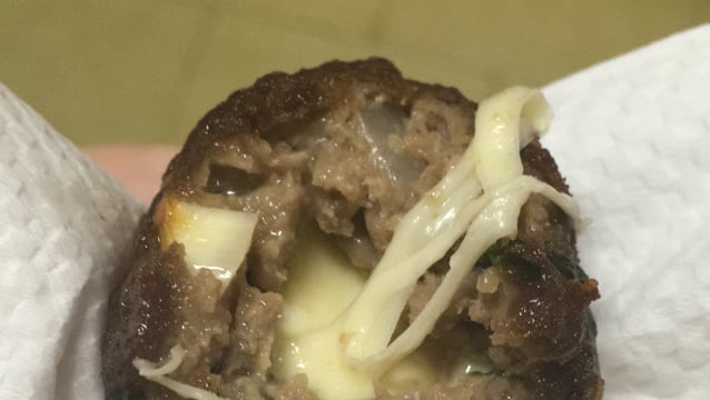 Abra um pouco da massa na palma da mão e recheie o bolinho de carne com um cubinho de queijo.