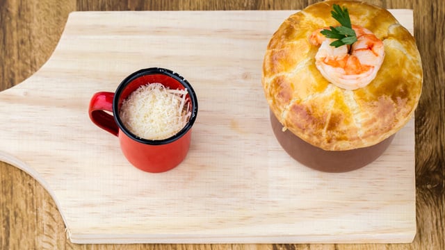 Em uma panela, coloque o azeite, junte o camarão e deixe refogar um pouco.