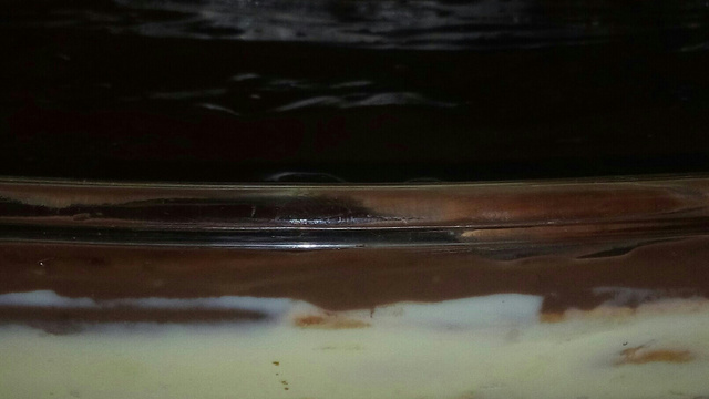 Primeiro coloque uma camada de recheio e outra de biscoito (já molhado no leite com achocolatado).