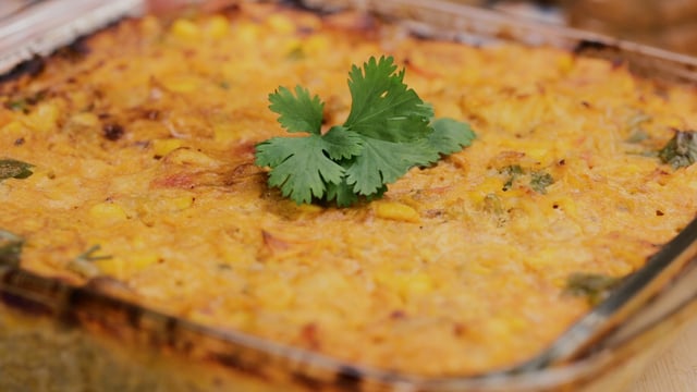 Leve a mistura a um refratário untado com manteiga e coberto com papel laminado e asse em forno médio por cerca de 40 minutos ou até que o arroz esteja cozido.