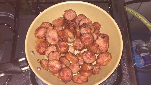 Adicione os quatro pedaços de linguiça e leve ao fogo.