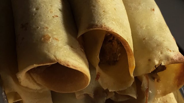 Recheie as panquecas com carne moída já preparada e um pouco de queijo mussarela.