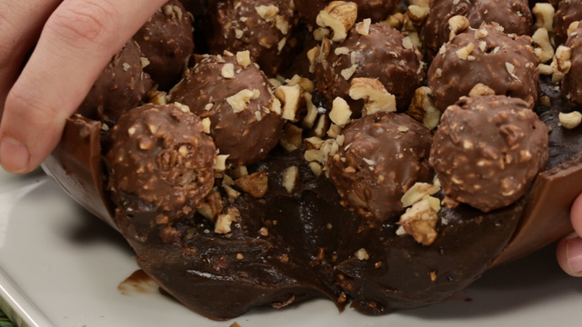 Cubra o brigadeiro com bombons Ferrero Rocher e finalize com pedaços de nozes.