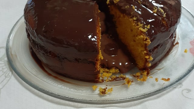 Desenforme o bolo e acrescente toda a cobertura no buraco do bolo, ela irá escorrer um pouco para os lados.