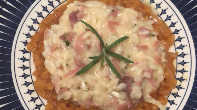 Acrescente mais uma concha do caldo, o presunto parma picado e mexa levemente.