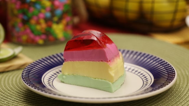 Escolha mais 3 cores de gelatina e dissolva em 150 ml de água fervente para cada um.