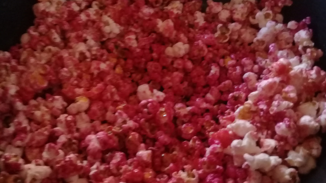 Em seguida, despeje a mistura nas pipocas aos poucos e mexendo sempre.