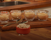 Retire do fogo, acrescente 500 g de amendoim torrado e moído, uma lata de creme de leite com soro e misture bem. Coloque o creme em copinho e sirva
