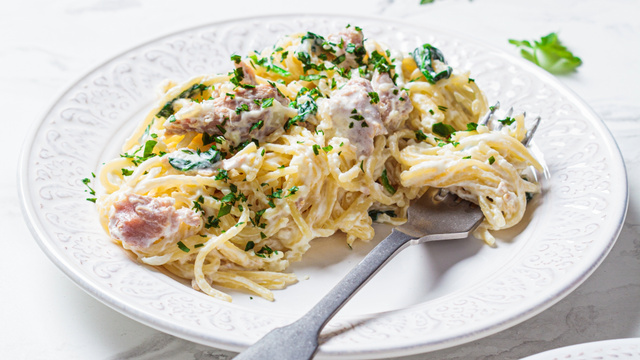 Esta receita deliciosa e prática de macarrão com atum e creme de leite vai encantar o paladar de toda a sua família. O espaguete, cozido até atingir o ponto firme ao dente, é a base para esta criação gastronômica, mas nada impede que não o troque por outros tipos de macarrão que tiver em casa. Este prato é uma opção versátil para um jantar rápido ou um almoço reconfortante, não importa se está por conta própria ou com a família inteira. Com uma combinação de ingredientes simples de atum com macarrão e um processo de preparo descomplicado, esta receita prática pode ser tanto um acompanhamento quanto o prato principal da sua refeição. O creme de leite com uma dose de maionese e extrato de tomate deixa esse prato deliciosamente cremoso e junta tudo em um prato harmônico. Aprenda a fazer esta receita de macarrão com atum simples e dê mai sabor para sua próxima refeição.