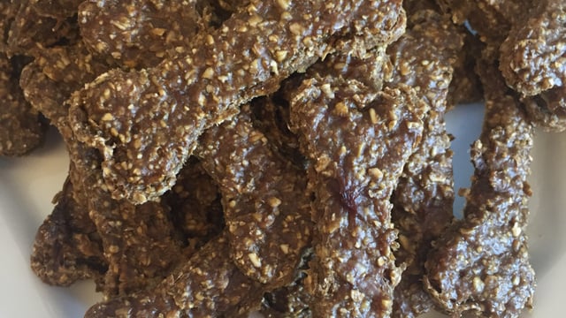 A textura do biscoito depende da quantidade de farinha de trigo. Com 4 xícaras o biscoito ficará mais firme. Se preferir um biscoito mais macio, utilize apenas 1 xícara. Armazene resfriado por até 2 dias. Ofereça o biscoito apenas como aperitivo! E lembre-se de consultar seu médico veterinário.