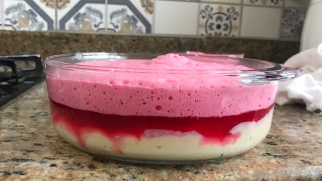 Bata as claras em neve. Acrescente a gelatina nas claras e bata até ficar toda cor de rosa.