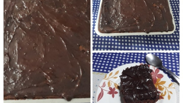 Coloque em uma assadeira untada e enfarinhada metade da massa de chocolate (feita acima).
