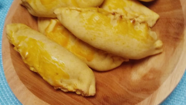 Em seguida, com o auxílio de um prato de sobremesa, corte a massa em um círculo, recheie e feche como se fosse um pastel em meia lua.