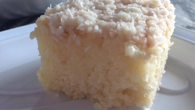 Despeje o leite condensado por todo bolo e, em seguida, espalhe o coco ralado hidratado no leite.