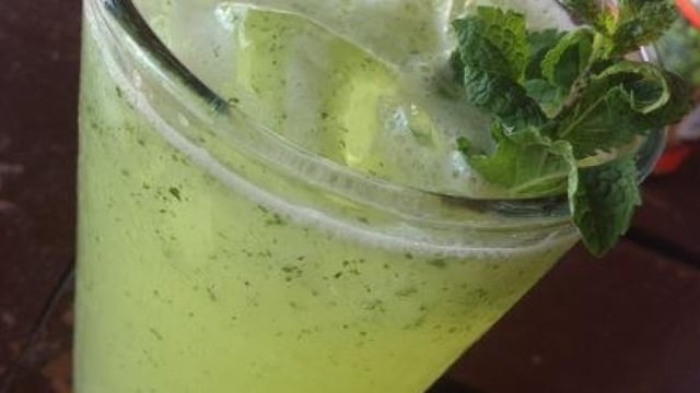 Coloque no liquidificador e bata com o limão inteiro sem a casca, o gengibre, o hortelã e o 1/2 copo de água.