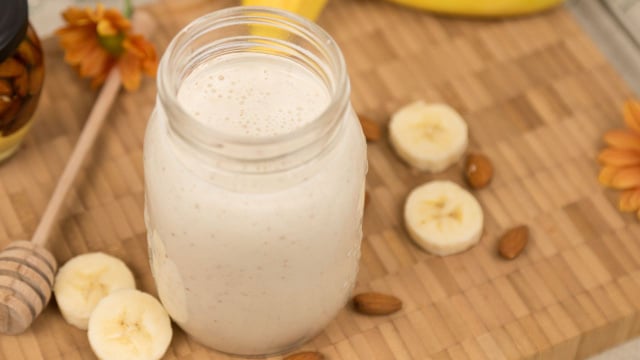 Bata no liquidificador as bananas, o açúcar, o leite e o gelo.