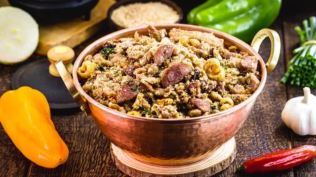 Coloque mais caldo de feijão, sirva com ovo frito caipira com a gema mole, se preferir pode ser servido com arroz um pouco empaçocado ao refogá-lo tipo arroz japonês.