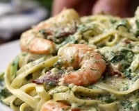Coloque o creme no fettuccine com o camarão, bacon, parmesão e salsinha.