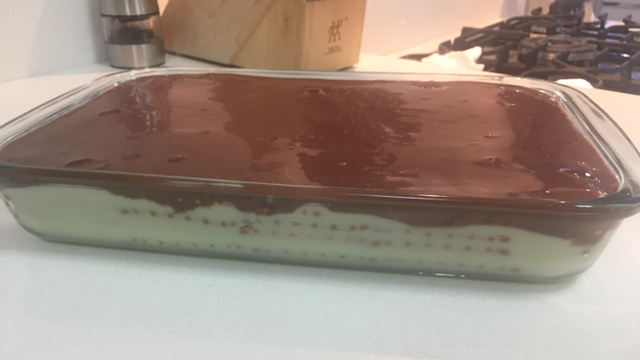 Despeje a mistura de chocolate em cima da última camada de bolacha.