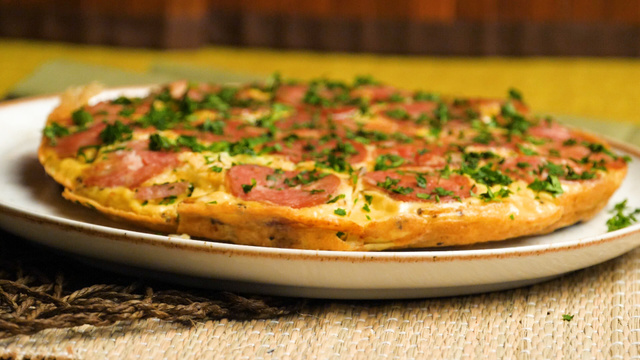 Com o auxílio de uma espátula, vire a fritada para cozinhar do oitro lado.