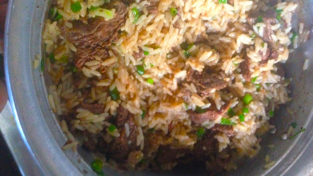 Quando secar totalmente a água, adicione um fio de óleo, cebola cortada grosseiramente e molho shoyo; refogue até a cebola ficar transparente por aproximadamente 15 minutos.