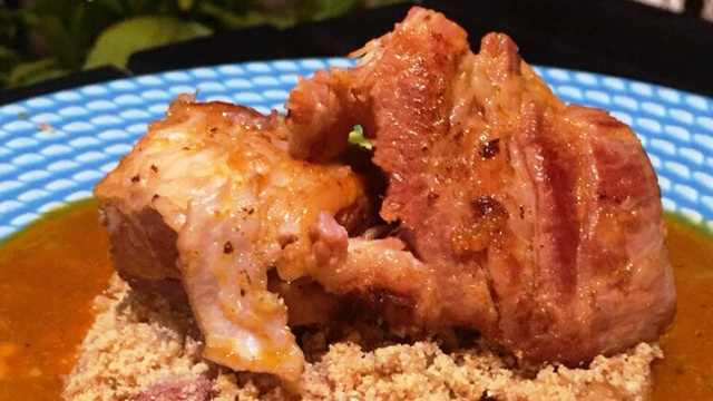 Acrescente a colher de corante e frite a barriga de porco até dourar.