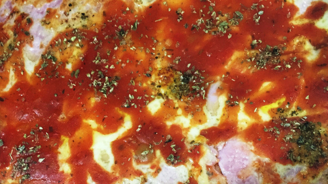 Coloque o molho, presunto, queijo, molho novamente e orégano.