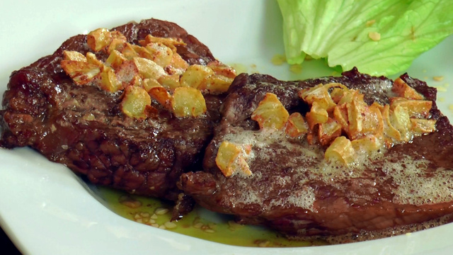 Quando os bifes estiverem dourados, retire da churrasqueira, acomode em um prato e adicione o delicioso molho de alho.