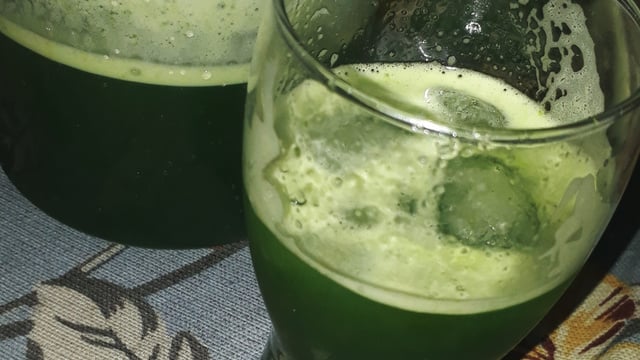 Coloque a couve, o suco dos limão e a água no liquidificador e bata tudo, até que não haja mais nem um pedaço da couve.