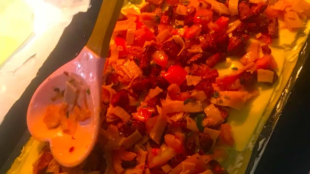 Em uma tigela, misture o milho, os tomates, a cebola, o cheiro-verde, o sal, a pimenta-do-reino e o orégano.