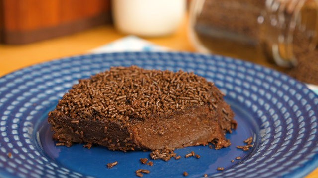Retire do forno e adicione o granulado com o brigadeiro ainda quente.