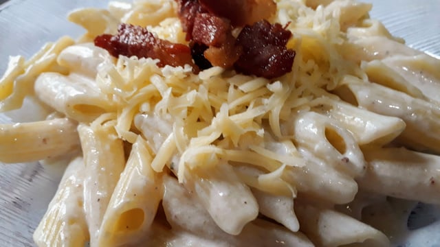 Cozinhe o macarrão, deixe no ponto al dente, escorra e reserve.