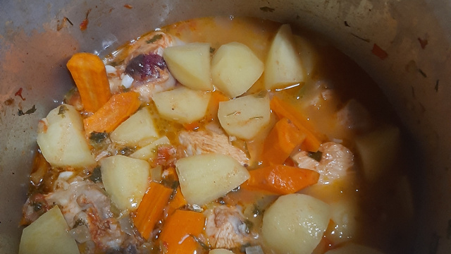 Depois, adicione água o suficiente para cobrir o frango, deixe cozinhar em fogo alto até levantar fervura, abaixe o fogo para médio-baixo e tampe para cozinhar por 30 minutos ou até que ele esteja no ponto para ter um belo frango cozido na panela normal.
