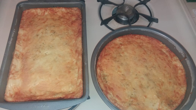 Despeje metade (ou 2/3) da massa em uma forma untada com margarina e farinha.