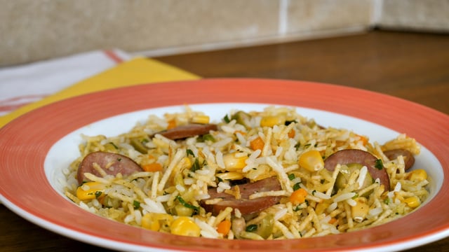 Aqueça 1 fio de azeite em uma panela e adicione a calabresa.