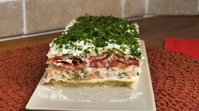 Finalize cobrindo o sanduíche com a mistura de ricota e salpicando salsinha e cebolinha a gosto.