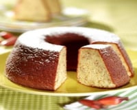 Asse em fôrma de furo central (19 cm de diâmetro) untada e enfarinhada, em forno preaquecido médio-alto (200 °C), por cerca de 30 minutos.