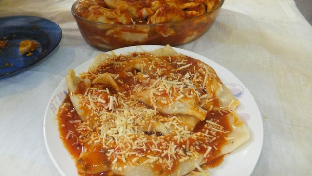 Coloque em uma travessa. Cubra com o molho, queijo ralado ou mussarela ralada a seu gosto.