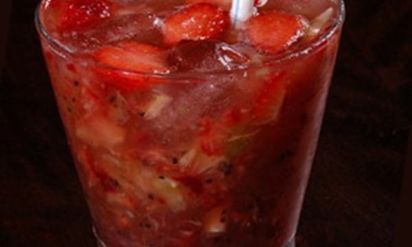 Coloque os morangos cortados em cubos nos copos e a caipirinha em seguida.